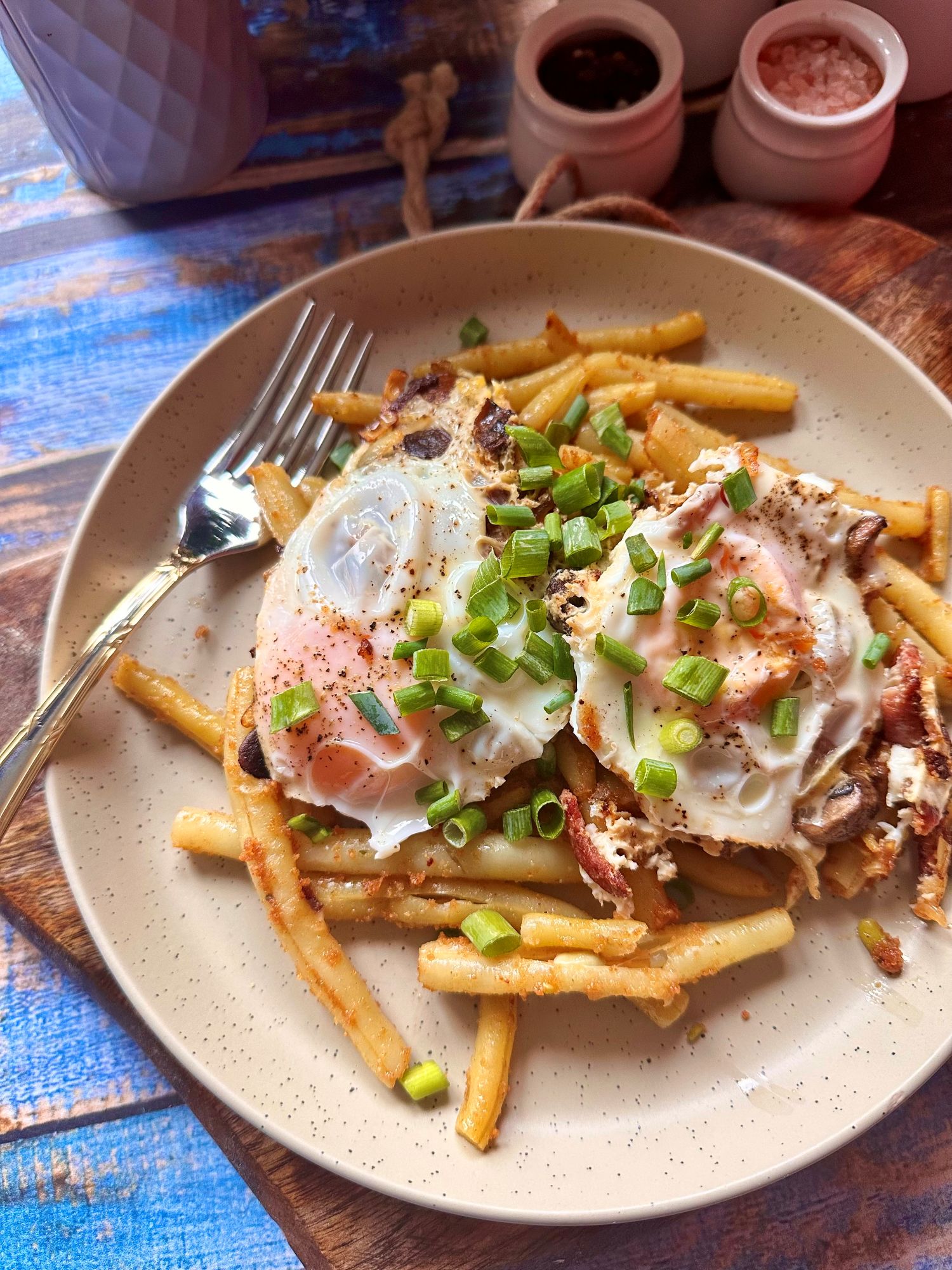 Jajka z boczkiem i pieczarkami na fasolce